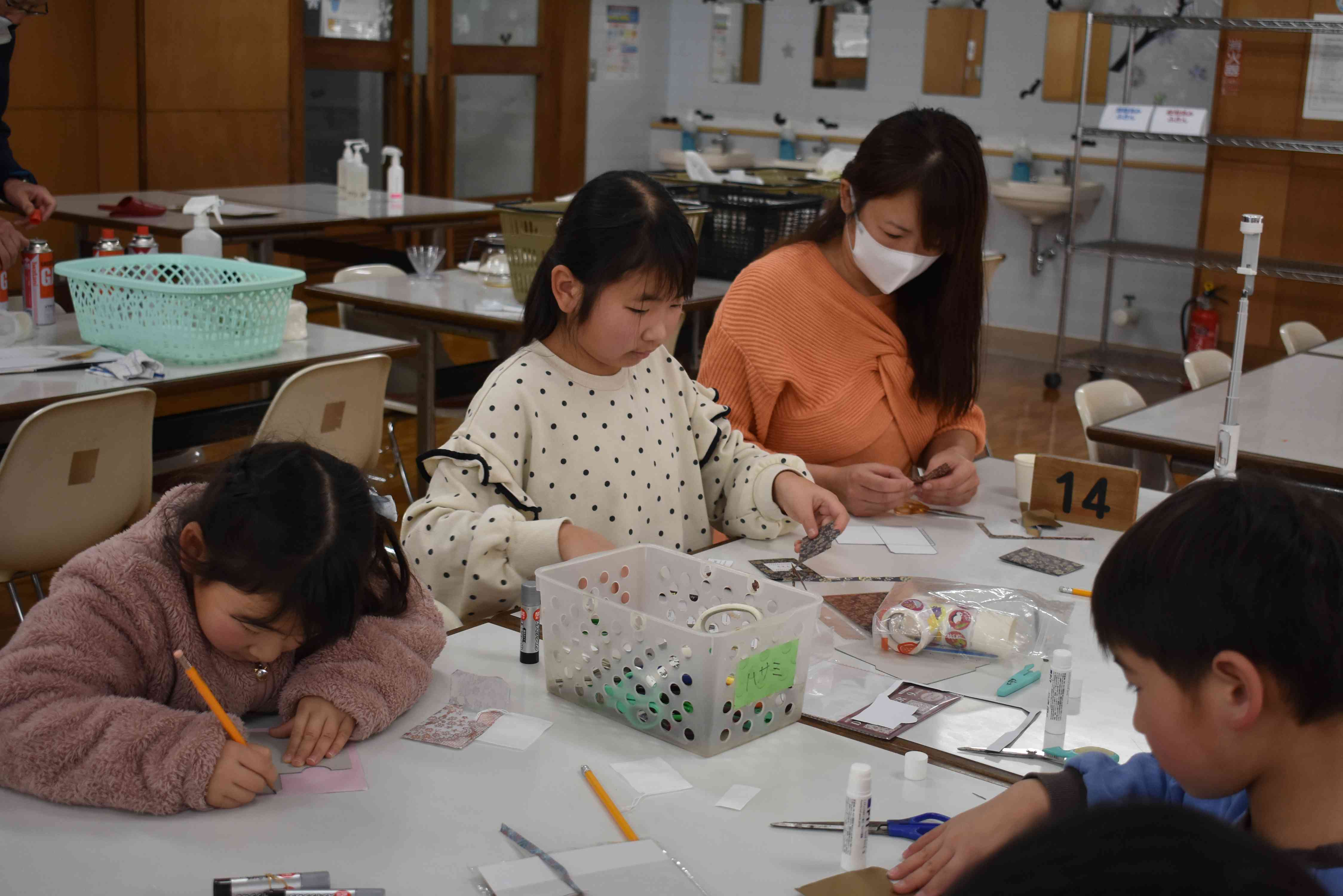 1日目のはじめの活動は天体クラフト作りです。ペーパークラフトのミニプラネタリウム作りに家族で協力して取り組みました。ピンで穴あけをするのが大変そうでしたが、全員が真剣に取り組み、完成させることができました。早く終えた人は2つ目のクラフトにも挑戦してもらいました。多くの人が複数のクラフト作りを行い、出来上がりに満足そうな表情をしていました。
