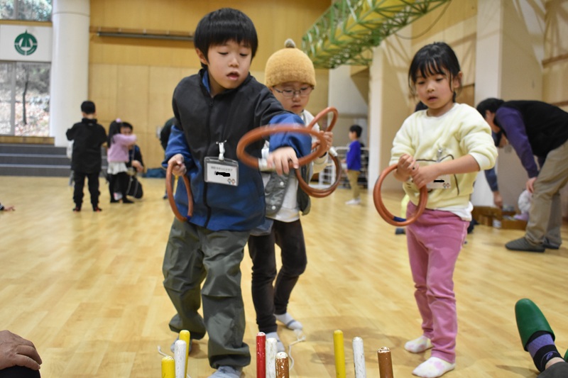 その後、落ち葉を大きさ順に並べるゲームや、落ち葉を使ったじゃんけんゲームをしました。