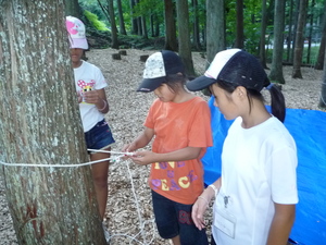 翌日のビバーク(野営)体験に向けて、ロープワークやシェルターの作成を練習しました。