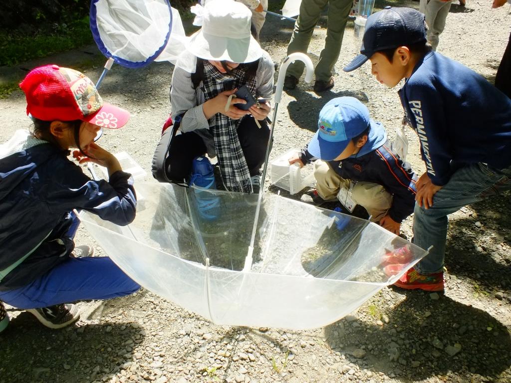 3つ目の活動です。木をたたいて、落ちてくる昆虫をビニール傘で受け止めて観察しました。