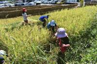 家族ごとに距離を取って稲刈りをすすめ、泥に足を取られたり慣れないカマの扱いに戸惑ったりしながら