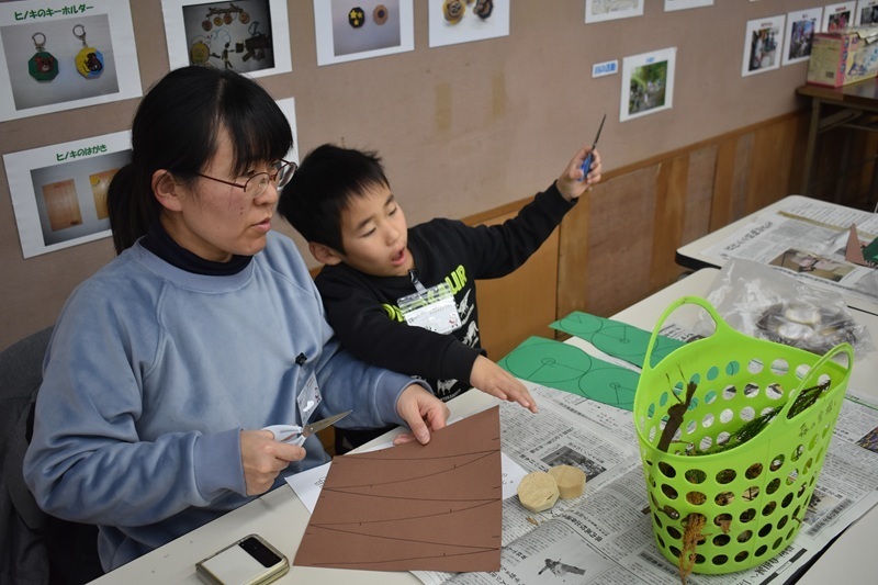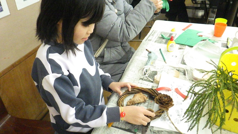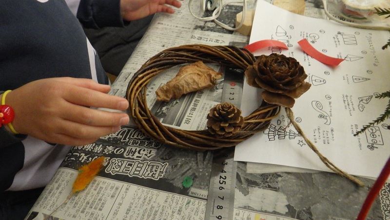 午前中に探してきた木の実や枝、葉っぱなどで、飾り付けていきます。