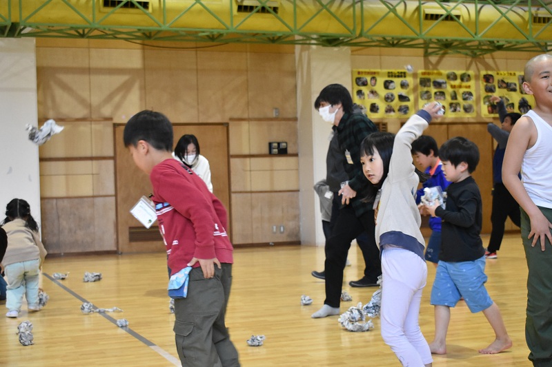 新聞紙雪合戦は、相手にぶつけるのではなく、相手の陣地にたくさん新聞紙をいれたほうが勝ち!
