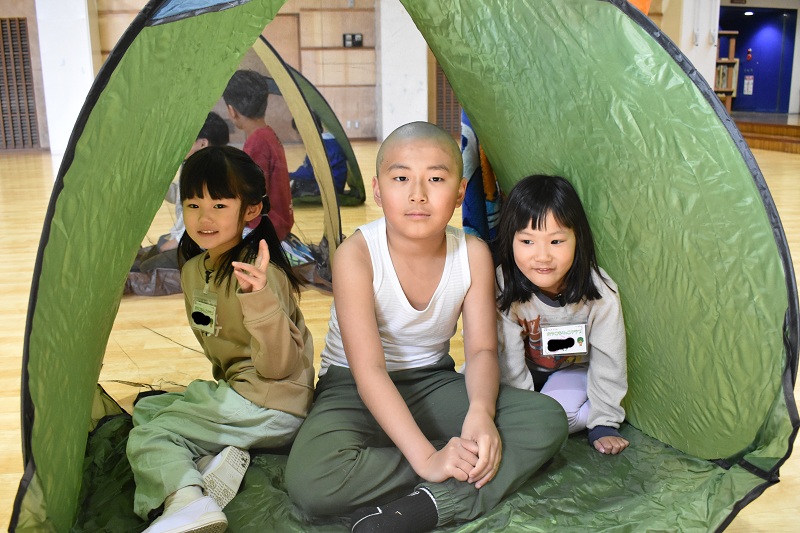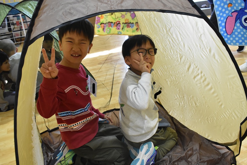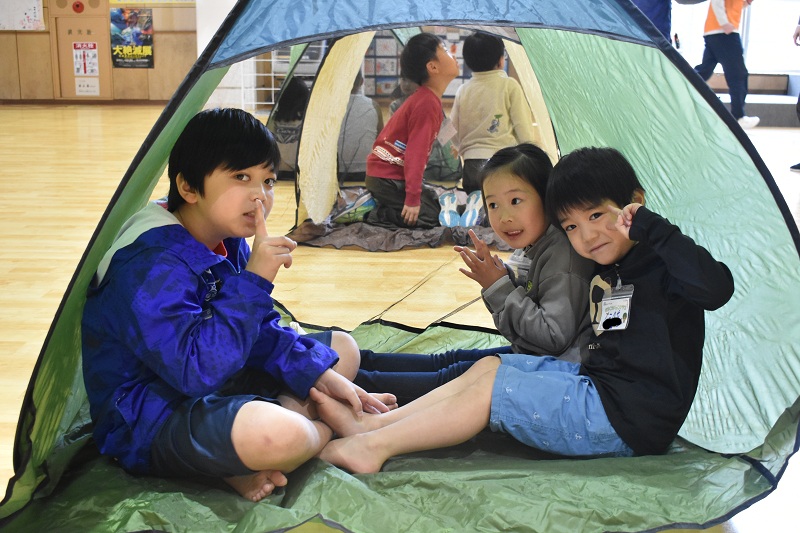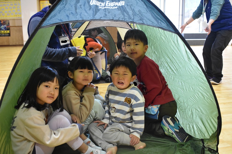 うちのこど~こだ!は、テントに隠れている子ども達が小さく返事をして、どのテントに隠れているか